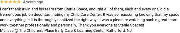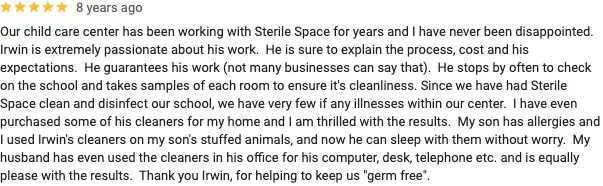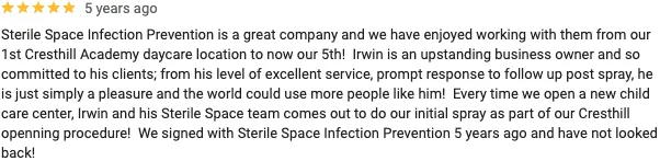 We loved every aspect of our experience with Irwin. Very professional. Very accommodating to our business. Since we are a 7-day/week business, we had to find a time when no kids or anyone else was in the facility. We also had great results from the treatment and found it very effective in being able to explain to prospective members about how we keep our facility super healthy and clean. The treatment totally helped us keep our facility super clean and safe for everyone