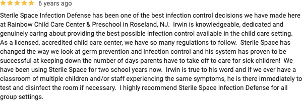 We take pre-service bio-contamination readings with an ATP meter. That is what the CDC, EPA and professional food plant inspectors use to determine a facility’s biological cleanliness. Then we return a few times during the year to take follow-up readings to show the considerable decrease in bio-load on your surfaces. You are also provided with a Certificate of Treatment for public display, and flyers for parents.